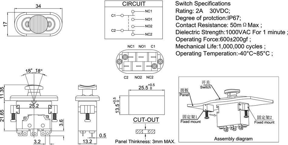 True ON-ON-ON triple-throw switch options 真正的實(shí)現(xiàn)ON-ON-ON三檔開(kāi)關(guān)功能 Switch contacts sealed to IP68S. With the optional開(kāi)關(guān)防水達(dá)IP68S級(jí)別。 Tested up to 1 million cycles 開(kāi)關(guān)壽命達(dá)100萬(wàn)次 Maintained or momentary action, single or double pole Logic level only 開(kāi)關(guān)可以做到單極與雙極邏輯控制 Standard and large rocker style sizes 開(kāi)關(guān)柄可以定制 Mining vehicle 應(yīng)用于礦用車(chē)輛 Large agricultural machinery大型農(nóng)業(yè)機(jī)械 Aerial work vehicle 高空作業(yè)車(chē)輛